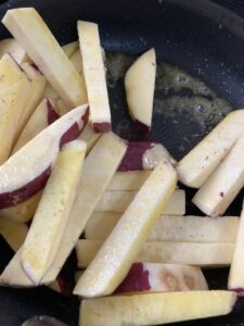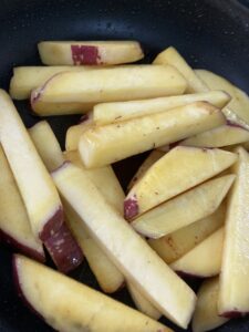 熱したフライパンにカットしたサツマイモとバターを加えて中〜強火で加熱します。