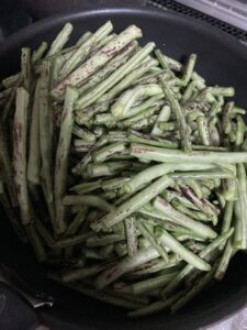 5〜10cmにカットしてフライパンに加えて空炒りします。