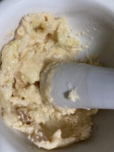 ニンニクと砂糖をすり潰してペースト状にしたら輪切りにしたタカノツメと醤油を混ぜ合わせておきます。