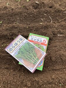 真ん中にのらぼう菜。のらぼう菜の株元をマルチングしてもらえるように端にレタスの種を蒔きます^^