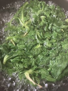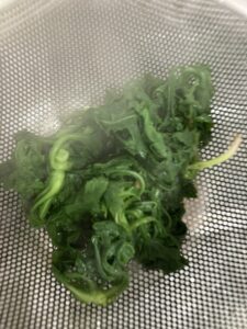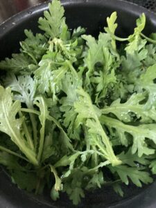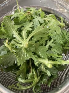 Cooking 春菊をおひたしに 2025年12月9日 onatsu 庭の菊も満開ですが、畑の春菊も食べごろです。 脇芽を摘み取りお水でよく洗います。 たっぷりのお湯を沸かしたら塩大匙1を加えて茹でていきます。 沸騰したらザルに上げたら完成です^^