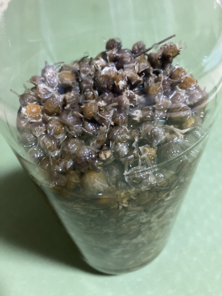 半年ほど前ローマンカモミールが満開だった頃に作ったドライフラワーをウォッカに漬けて成分を抽出しました♪