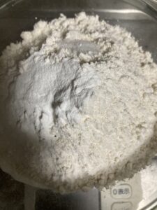 強力粉、ベーキングパウダー、塩を計り入れます。