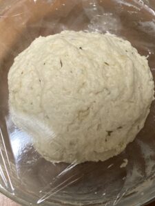 粉っぽさがなくなったら一まとめにしてラップをかけて暖かい場所で30分〜1時間程発酵させていきます。