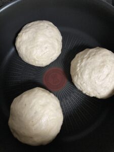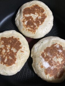 生地を3等分してシーズを包んで中火に熱したフライパンで焼いていきます。