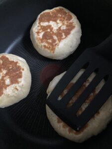 フライ返しで抑えて平にしていきます。狭いフライパンに欲張って3個も一緒に焼いたので今回はあまり平たくできませんでした。
