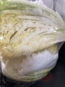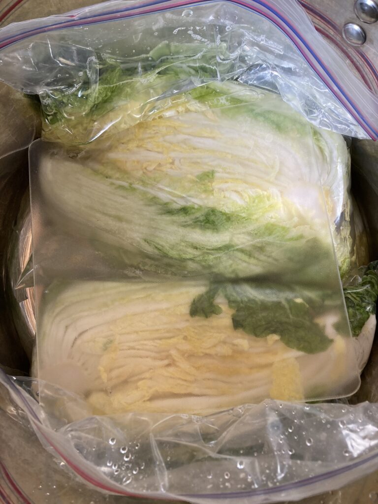 ジッパー付きの袋に入れたら白菜の重さの12%の塩を入れて空気を抜いて封をします。