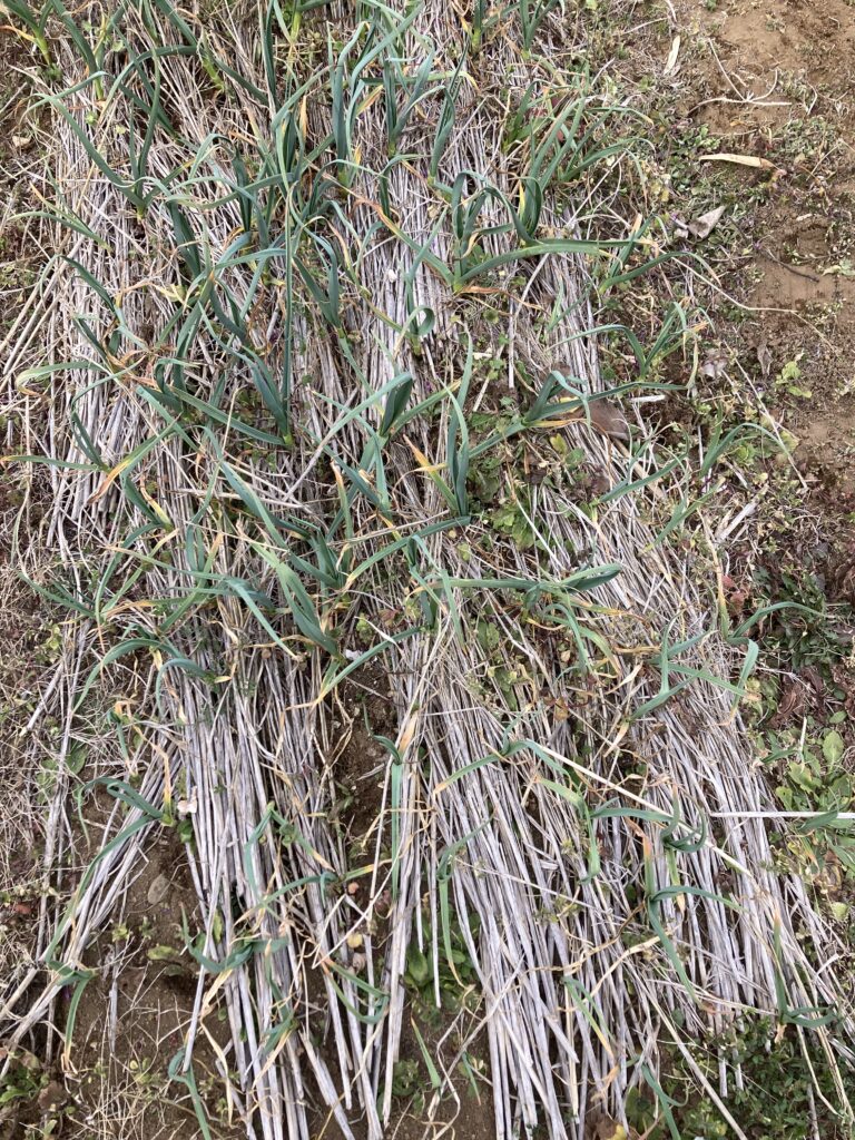 これから気温は上り坂♪という事で。ニンニクを植えた箇所の不織布を外してみると・・・・