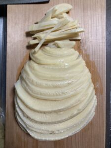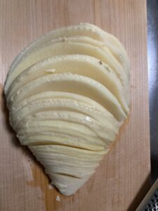 スライスしたら平らにして少しずつずらしながら切っていきます。